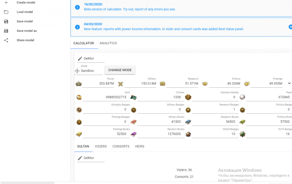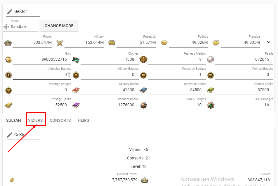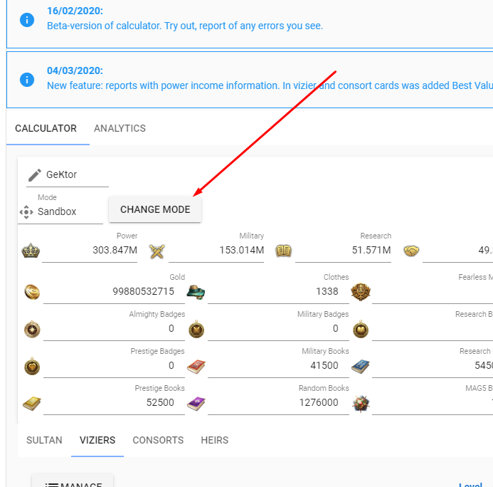 The sandbox. In this mode, you can change the characteristics of your sultan as much as you like. Resources are not taken into account or verified.