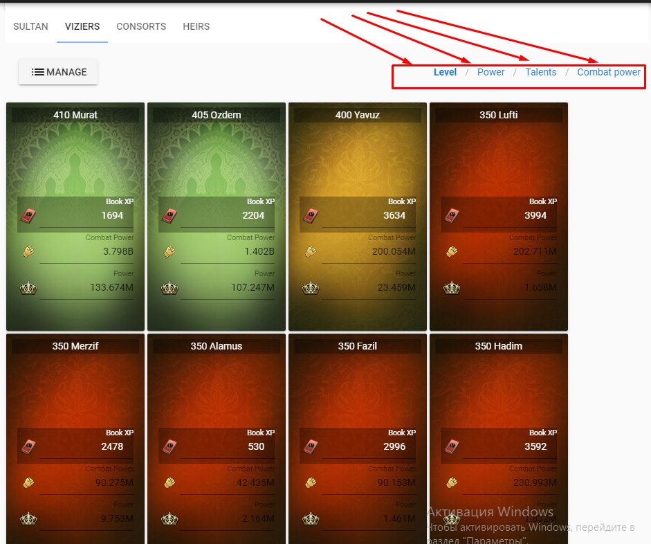 In the “visers” tab will open all visers of the sultan, taking into account attributes, bonuses and developing.