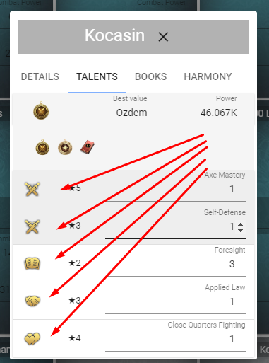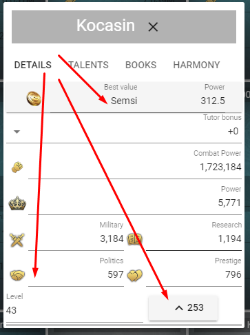 To get a recommendation for developing a talent with tokens or experience, you need to click in the fields of “tactics,” “politics,” “culture,” “science” (See. screen number 8, shown by arrows).